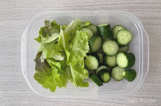 リーフレタスは洗って水切りし、キュウリは1.5cm幅に切り、盛り付けるタッパーに入れる