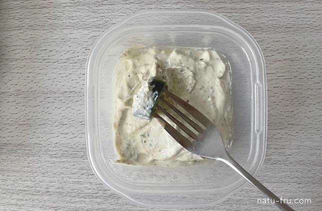ギリシャ豆乳ヨーグルト、その他の調味料を「高さがある円柱容器」に入れて、ハンドブレンダーでかるくミキシング。盛り付け用の容器に入れる。